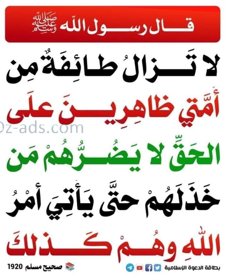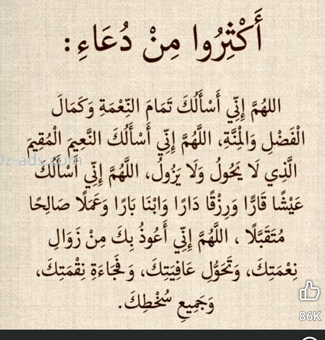 اللهم انى اعوذ بك من زوال نعمتك وتحول عافيتك وفجأة نقمتك وجميع سخطكاللهم أنى أسألك تمام النعمه وكمال الفضل والمنة اللهم انى اسألك النعيم المقيم الذي لا يحول ولا يزول اللهم انى اسألك عيشا قارا ورزقا دارا وابنا بارا وعملا صالحا متقبلا اللهم انى اعوذ بك من زوال نعمتك وتحول عافيتك وفجأة نقمتك وجميع سخطك0 Σχόλια 0 Μοιράστηκε 291 Views - قال صلى الله عليه وسلم: "لا تزال طائفة من أمتي على الدين ظاهرين، لعدوهم قاهرين، لا يضرهم من خالفهم إلا ما أصابهم من لأواء، حتى يأتيهم أمر الله. وهم كذلك"قال صلى الله عليه وسلم: "لا تزال طائفة من أمتي على الدين ظاهرين، لعدوهم قاهرين، لا يضرهم من خالفهم إلا ما أصابهم من لأواء، حتى يأتيهم أمر الله. وهم كذلك"0 Σχόλια 0 Μοιράστηκε 302 Views